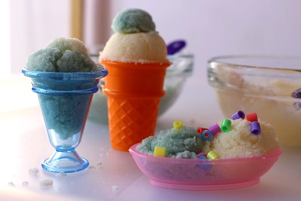 Pour réaliser cette fausse crème glacée, j’ai utilisé un pot de bicarbonate alimentaire (on en trouve au rayon sel et poivre des supermarchés) de l’eau et du colorant alimentaire. J’ai trouvé une recette plutôt chouette sur ce site. Après avoir versé la moitié du pot de bicarbonate dans un bol, j’ai ajouté progressivement un peu d’eau colorée (eau + 2 gouttes de colorant) puis j’ai mélangé jusqu’à obtention de la consistance souhaitée. Il faut très peu d’eau. La texture ressemble a du sable mouillé, dès qu’il est possible de faire un petit pâté ou une boule, c’est prêt. Visuellement, on dirait vraiment de la glace.
