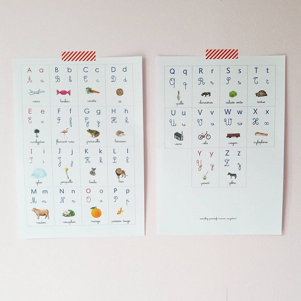 Il n’est certainement pas parfait, mais comme vous l’avez beaucoup aimé sur Instagram, je vous propose de le télécharger en fin d’article. On peut le laisser en affiche, sur un mur, comme nous le faisons à la maison. J’en ai également imprimé un deuxième exemplaire que j’ai plastifié puis coupé. On obtient ainsi des petites cartes. Je crois que Poupette trouve ça plus ludique de cette manière, elle aime les manipuler, elle s’amuse à les reclasser dans l’ordre alphabétique, à trier les consonnes des voyelles, et à reproduire d’elle-même les lettres de son choix, juste en observant le modèle. C’est pour elle une grande fierté!