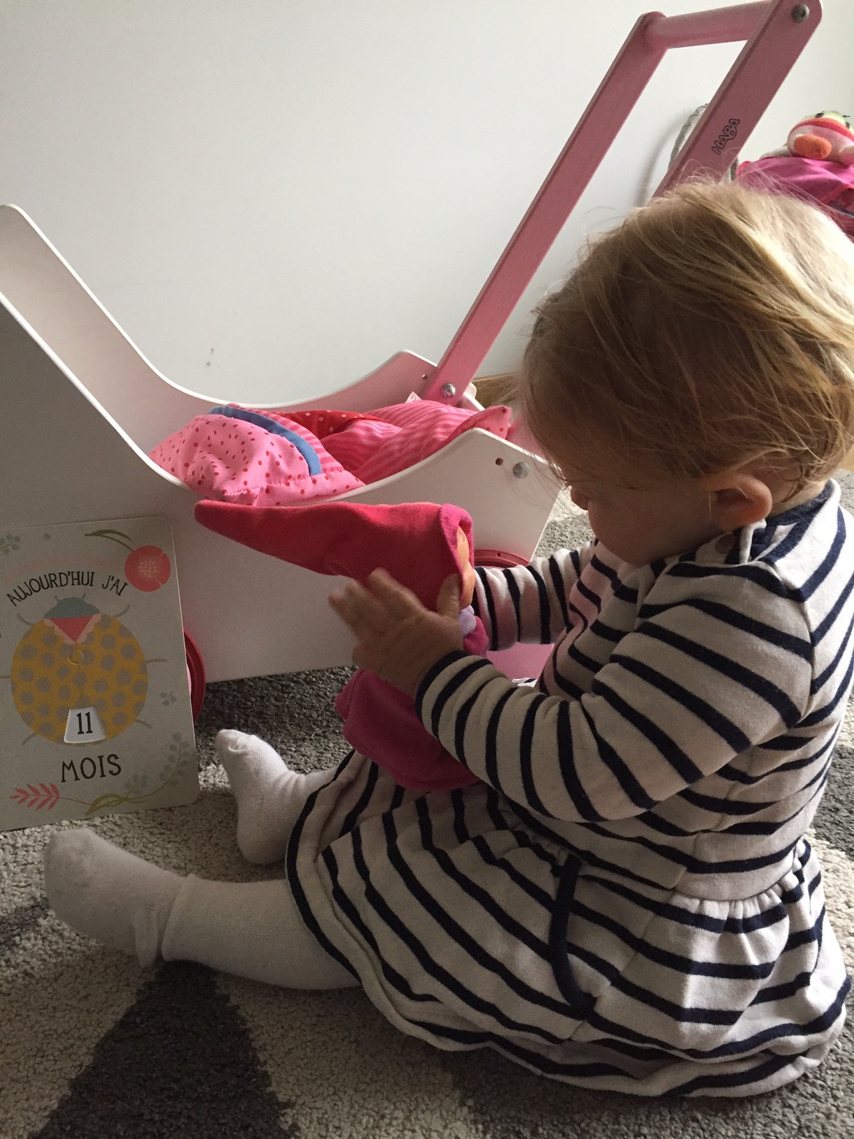 Elle fait sa petite vie et a découvert les poupées…grâce à sa grande soeur surtout.